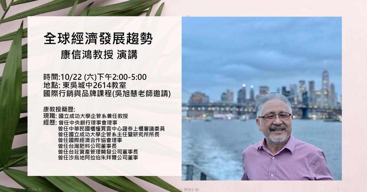 敬邀參與東吳EMBA【國際行銷與品牌課程】專題演講 主持人:吳旭慧兼任助理教授 主講人:康信鴻教授(成功大學企管系兼任教授/前台肥董事長) 主題:全球經濟發展趨勢 時間:10/22 (六) 14:00-17:00 地點:東吳大學城中校區鑄秋大樓2樓2614教室 ※本講座依教室座位敬邀參與東吳EMBA【國際行銷與品牌課程】專題演講 主持人:吳旭慧兼任助理教授 主講人:康信鴻教授(成功大學企管系兼任教授/前台肥董事長) 主題:全球經濟發展趨勢 時間:10/22 (六) 14:00-17:00 地點:東吳大學城中校區鑄秋大樓2樓2614教室 ※本講座依教室座位敬邀參與東吳EMBA【國際行銷與品牌課程】專題演講 主持人:吳旭慧兼任助理教授 主講人:康信鴻教授(成功大學企管系兼任教授/前台肥董事長) 主題:全球經濟發展趨勢 時間:10/22 (六) 14:00-17:00 地點:東吳大學城中校區鑄秋大樓2樓2614教室 ※本講座依教室座位